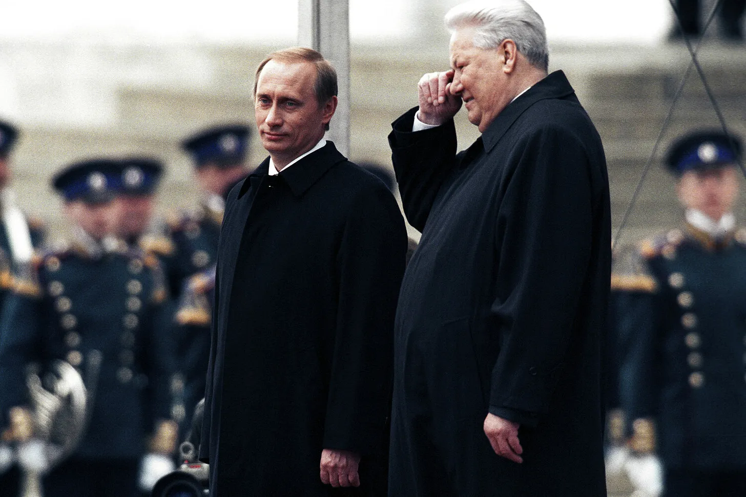 Putyint beiktatják elnökként 2000 májusában. Mögötte Jelcin áll.