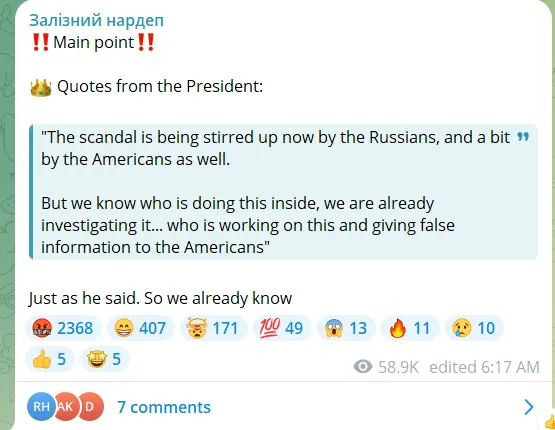 Zelenszkij állítólag arról is tájékoztatta az egybegyűlteket, hogy „korrupció minden országban létezik”, és hogy a bűnüldöző szervek jelenlegi válasza a korrupciós botrányra elegendő.