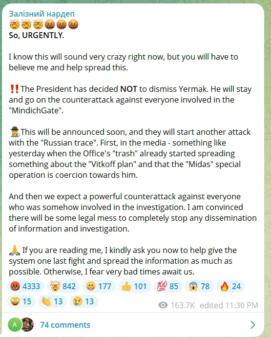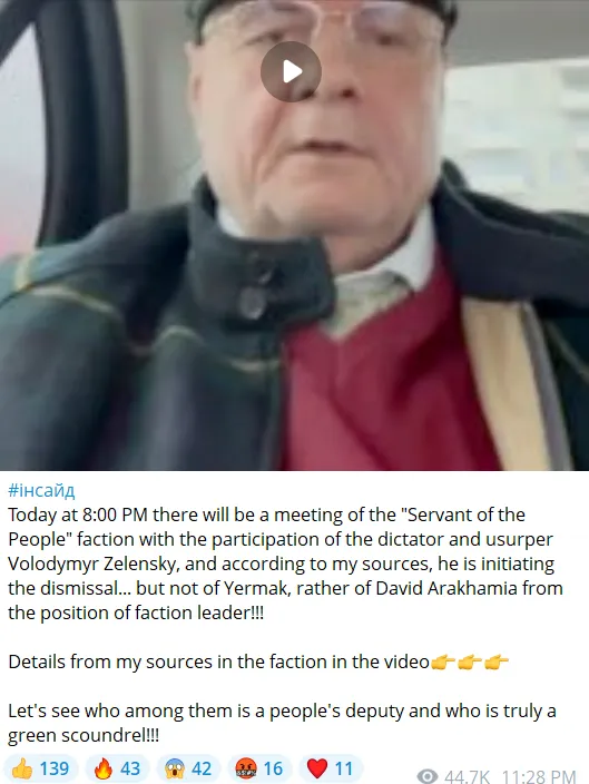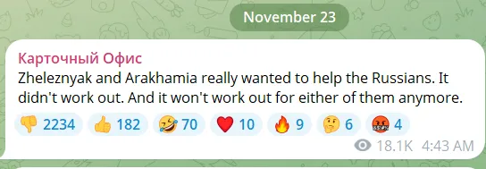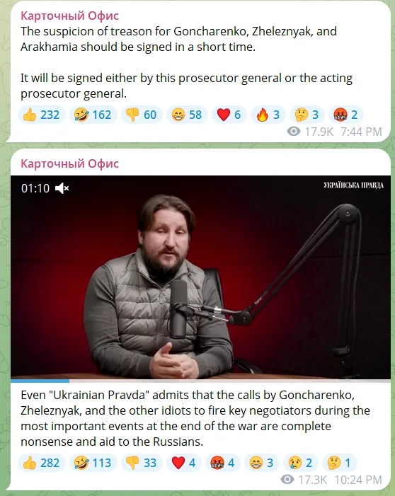 Az Office of Cards egy brutálisan Jermak-párti táviratcsatorna. November 23-án azzal vádolta Arakhamiát és a liberális ellenzéki képviselőt, Zseleznyakot, hogy együttműködve próbálják Ukrajnát békemegállapodás aláírására bírni Oroszországgal. A logika az, hogy Zseleznyak túl sokat beszél a korrupcióról, Arakhamia pedig gyanúsan hajlandónak tűnik a békéről beszélni. Valójában ez a narratíva, miszerint aki korrupcióról beszél, az Oroszország barkácsolója, különösen népszerű a zelenszkiták körében: