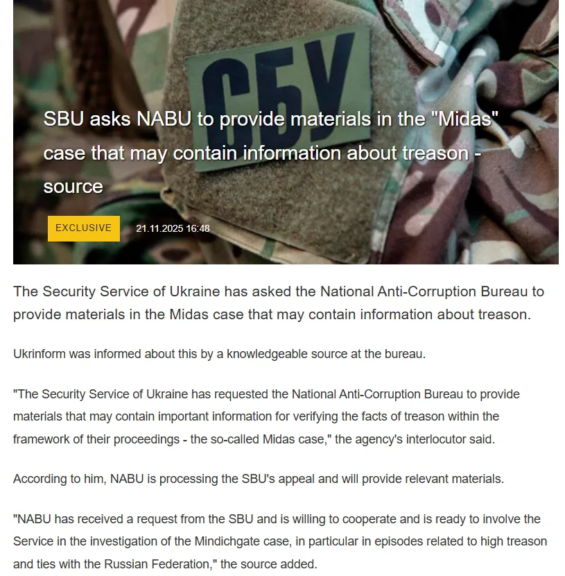 November 21-én az ukrán állami hírügynökség, az Ukrinform arról számolt be, hogy az SZBU felkérte a Nemzeti Biztonsági Hivatalt (NABU), hogy bocsássa rendelkezésükre a Midas-ügyben – a NABU Zelenszkij környezetében történt korrupcióval kapcsolatos nyomozásában – található anyagokat.