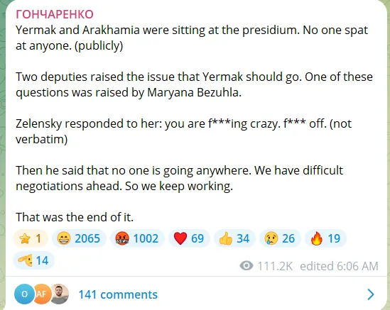 Ezen jelentések közül sok Jaroszlav Zseleznyak-tól, a Nyugat-barát Holosz párt Zelenszkij-ellenes képviselőjétől származik. Íme, amit Zseleznyak a SzotP pártbeli forrásaitól hallott a november 20-i találkozóról :