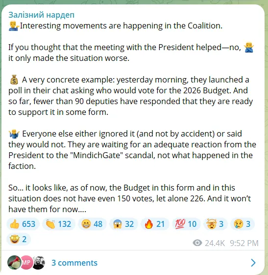 A Szolgálatokról szóló legfrissebb hírek november 26-án érkeztek a már említett Jaroszlav Zseleznyak képviselőtől. Zseleznyak arról számolt be , hogy a több mint 230 fős Szolgálat még 90 szavazatot sem tud összegyűjteni Zelenszkij 2026-os költségvetése mellett. Ez nem a legjobb.