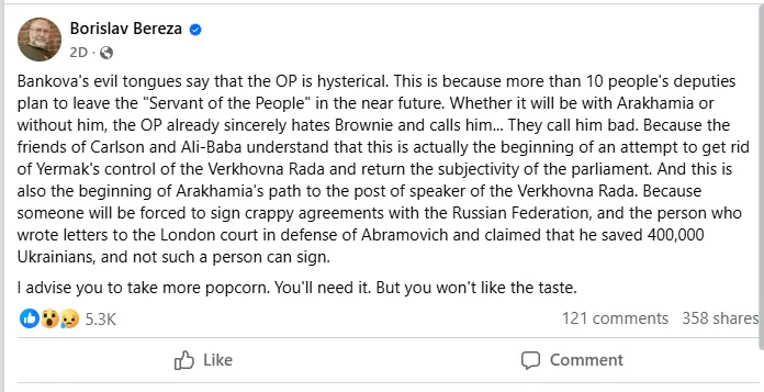 November 21-én a strana.ua a SzocP forrásaira hivatkozva azt írta, hogy a Bankova (az Elnöki Hivatal - Jermak) utasította az Ukrán Biztonsági Szolgálatot (SZBU), hogy indítsanak büntetőeljárást Arakhamia ellen. Kétségtelen, hogy az SZBU azt tenné, amit júliusban tett a korrupcióellenes szervekkel - azzal vádolná őket, hogy orosz kémek, és rögtönözne.