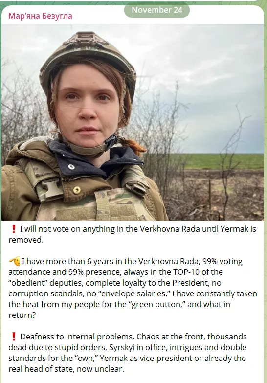 Nem csoda, hogy Zelenszkij összetűzésbe került Bezuhla képviselővel. Szokásos skizofrén kirohanásában november 24-én kijelentette, hogy addig nem szavaz a parlamentben, amíg Jermak-ot el nem távolítják a posztról.