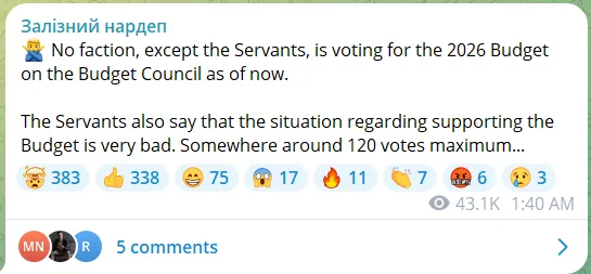 Jelenleg a Szolgák előtt álló fő feladat a 2026-os költségvetés elfogadása. Úgy tűnik, ebben nem állnak túl jól, ami rossz előjel Zelenszkij parlamenti hatalmára nézve. Jaroszlav Zseleznyak ellenzéki képviselő december 2-án ezt írta az ügyről: