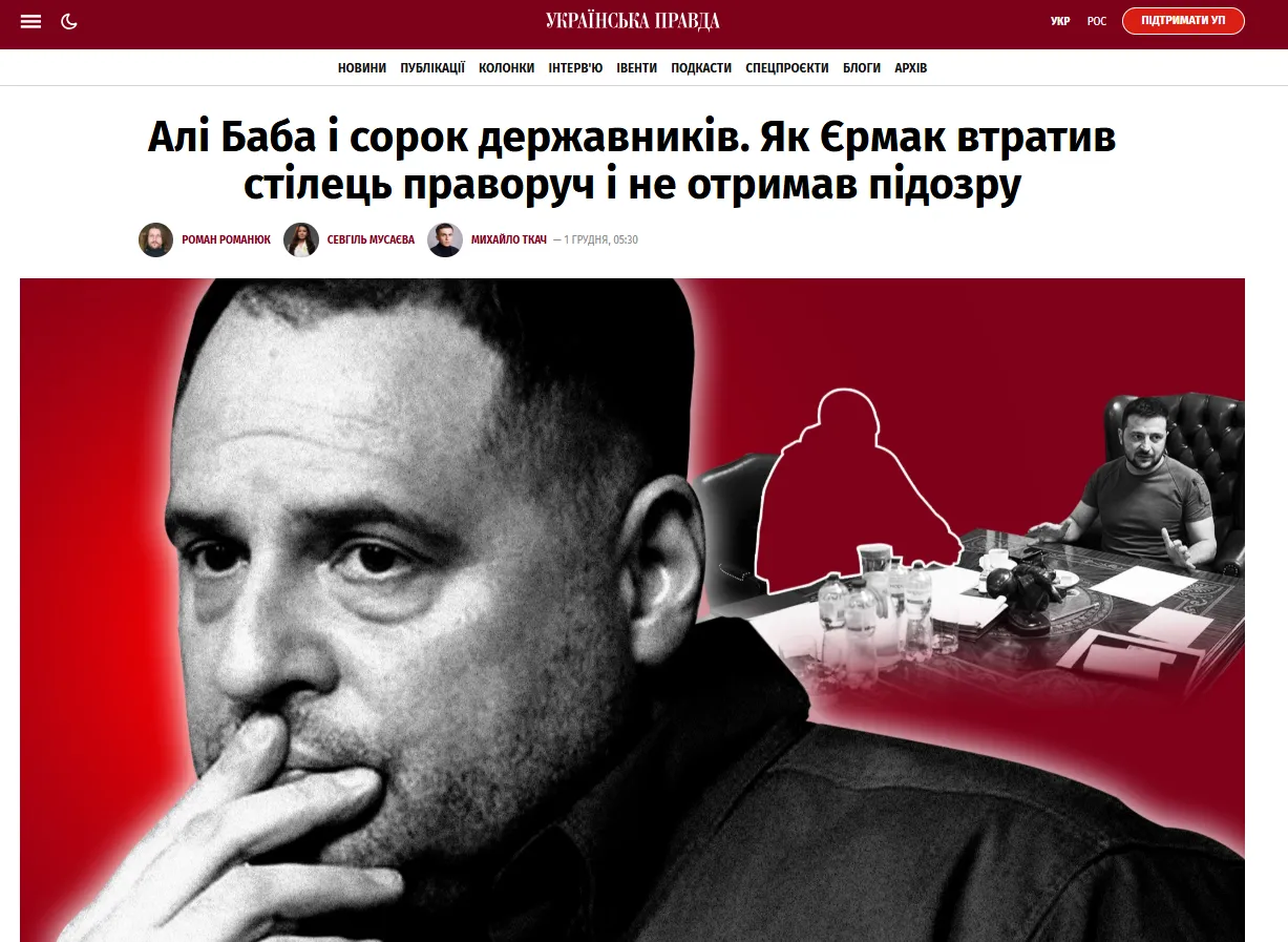 A hétvégén Mindics közeli barátját, Andrij Jermakot végre eltávolították az elnöki adminisztráció éléről. Zelenszkij sorsa összefonódik ennek a lépésnek a következményeivel. Az Ukrajinszka Pravda, egy Jermakot hevesen ellenző jelentős médiakiadvány december 1-jén cikket közölt Jermak bukásáról.