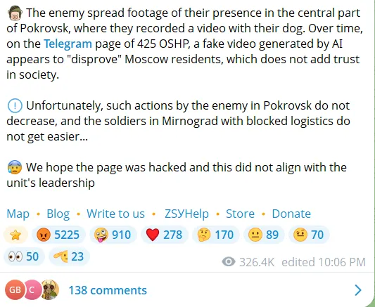 Manko legújabb esete december 2-án történt. A híres 425. rohamdandár, a „Skala” (szikla) közzétett egy videót az x-en, amely állítólag Pokrovszk központjában lévő erőiket mutatja. Miután kiderült, hogy a videót mesterséges intelligencia generálta, a bejegyzést törölték. A DeepState a következőképpen kommentálta a botrányt: