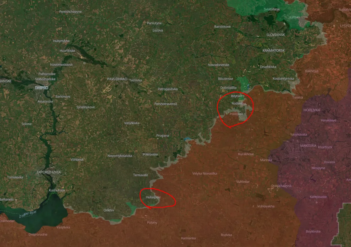 Huliaipole-tól északra található a Zaporizzsje, Donyeck és Dnyipropetrovszk megyék metszéspontja. Az orosz offenzíva idén júliusban-júliusban kezdődött a Dnyipropetrovszk megyében. Az ukránok kezdetben a Donbaszról való figyelemelterelési technikának gondolták, de hamarosan világossá vált, hogy az oroszok szisztematikus előrenyomulásra törnek itt. Ahogy itt írtam, számos oka van annak, hogy egy orosz áttörés délen, Zaporizzsje és Dnyipro városai (~1 millió lakos) felé valójában stratégiailag fenyegetőbb, mint a Donbasz többi részének elfoglalása.