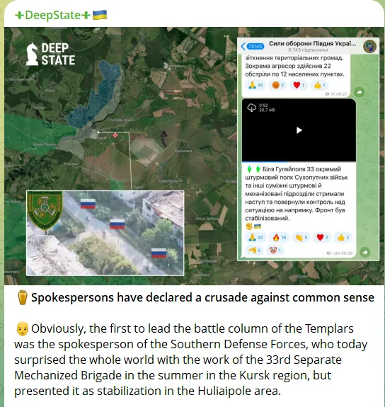 Egy november 29-i bejegyzésben a hadsereg hivatalos közösségi médiája gratulált Manko 33. gépesített rohamdandárjának a Huliaipole körüli állások állítólagos visszafoglalásához. A közösségi média felhasználói azonban hamarosan észrevették, hogy a csatolt videón zöld növényzet látható – már jóval november előtt eltűnt az összes növényzet. Hamarosan világossá vált, hogy a felvétel valójában Oroszország Kurszk megyéjében készült 2024-ben.