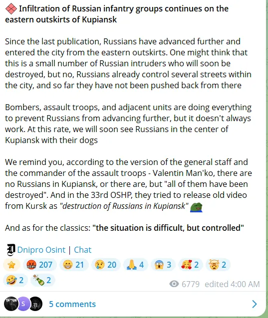 A cikk azzal zárja ezt a részt, hogy Huliaipole külvárosát egyik fél által sem ellenőrzött „szürkezónának” nevezi. A helyzet azonban még rosszabbnak tűnik, mivel kis számú orosz csapatok gyakran behatolnak a városba. A „Dnyipro Osint” november 30-i bejegyzéséből származó részletek képet adnak arról, hogy valójában hogyan is állnak a dolgok: