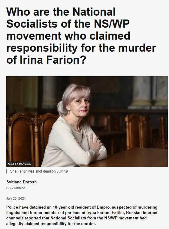 És ebben a teljes bukás, az ukrán etnikai nacionalizmus ikonjának abszolút, totális diadalának helyzetében – mintha egy deus ex machina lenne – orosz (?) neonácik jelentek meg a színpadon. Ők voltak azok, akik véget vetettek ennek a vitának. Kiáltványuk szövegében olyan indoklás szerepelt, amely logikus a posztszovjet tér „fehér felsőbbrendűségét hirdetők” kulturális kódexében. Azovot és személy szerint Biletszkijt [az Azov - EIU vezetőjét] szégyenletes tétlenséggel és faji kötelességük figyelmen kívül hagyásával vádolják. Iryna Fariont „faji árulással” és rombolással vádolják.