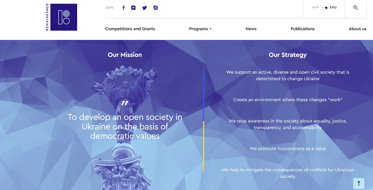 A Renaissance Alapítvány Ukrajna egyik fő Soros-szervezete. Ukrajna liberális civil társadalmának számos fontos személyisége rendelkezik tapasztalattal benne vagy a kapcsolódó nem kormányzati szervezetekben - EIU.