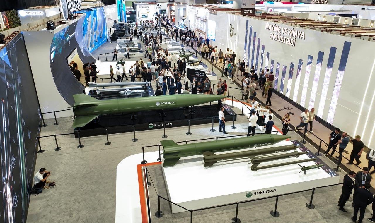 A Roketsan rakétáit a 17. Nemzetközi Védelmiipari Vásáron (IDEF 2025) mutatják be Isztambulban, Türkiye államban 2025. július 26-án. A fotó forrása: Anadolu Ajansı