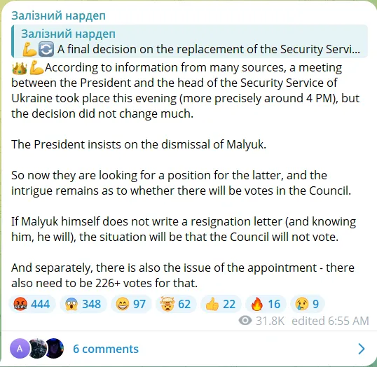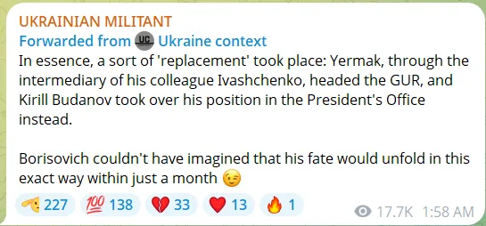 Az Ukrainian Militant újra közzétette az „Ukraine Context” című cikket is, amely szerint Ivascsenko kinevezése Jermak (Boriszovics) folyamatos befolyását szimbolizálja. Jermak és Budanov „helyet cseréltek”: