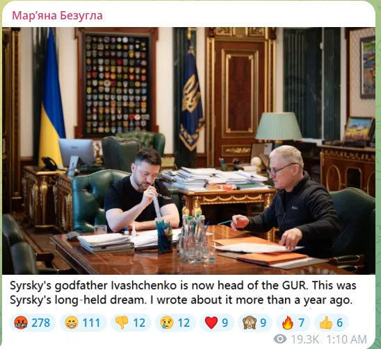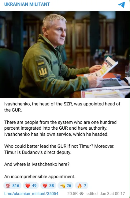 Lényeges, hogy a nagy GUR-táviratok, mint például az „Ukrán Militán-t”, nagyon elégedetlenek Ivascsenkoval. Jelentéktelen kívülállónak tartják, és azt kívánják, bárcsak a „Timur” harci álnéven ismert GUR-bennfentes foglalta volna el a helyet: