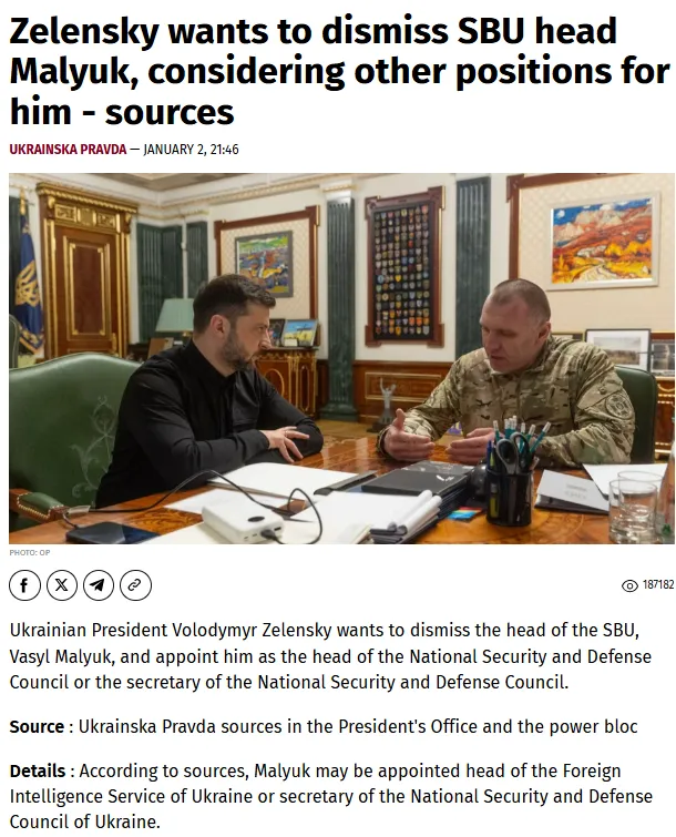 Január 2-án a nyugati tulajdonban lévő, Zelenszkij-ellenes, liberális nacionalista Ukrajinszka Pravda című lap arról számolt be, hogy Vaszilij Maljukot, az Ukrán Biztonsági Szolgálatok (SZBU) vezetőjét elmozdítják.