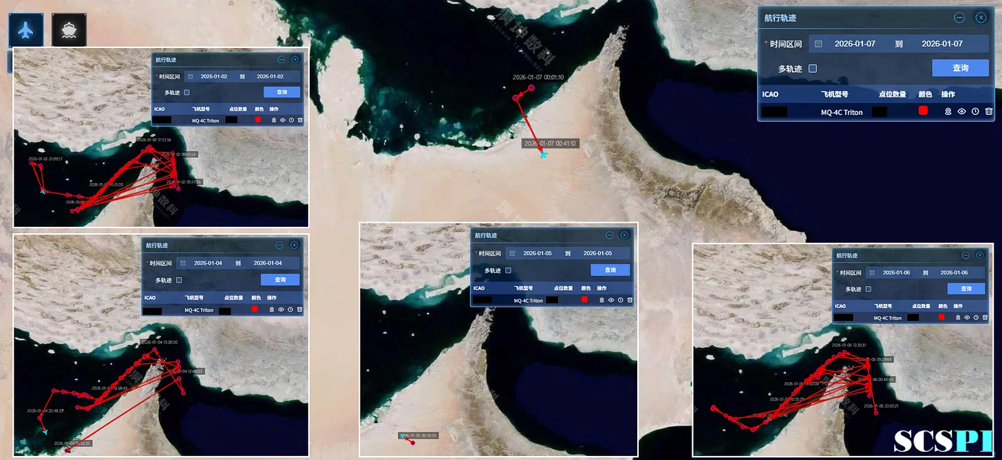 A vállalat az iráni vizek körüli amerikai felderítő tevékenység jelentős növekedését is észlelte. Január 1. és 7. között az amerikai hadsereg legalább 5 MQ-4C drónt vetett be közeli felderítésre a Hormuzi-szoros közelében, valamint a 7 P-8A tengeralattjáró-elhárító járőrgép bevetését. Ezek közül hat Al Udeidből indult, a Perzsa-öböl déli részén és a Hormuzi-szoroson repülve Irán megfigyelését végezte; egy bevetés az olaszországi Sigonellából indult, és Szíria és Libanon partjainál fekvő vizek felé vette az irányt.