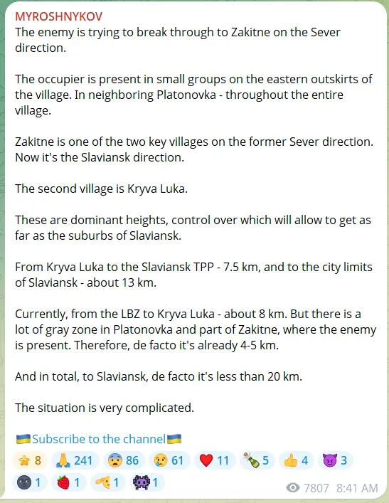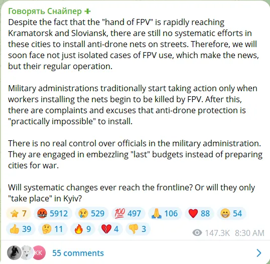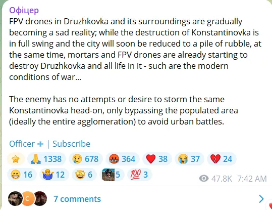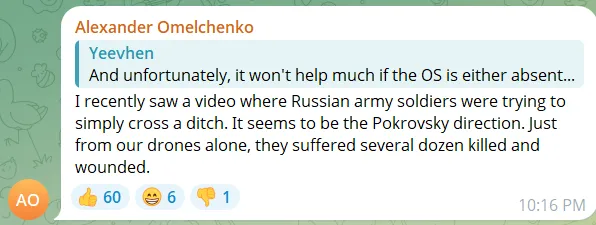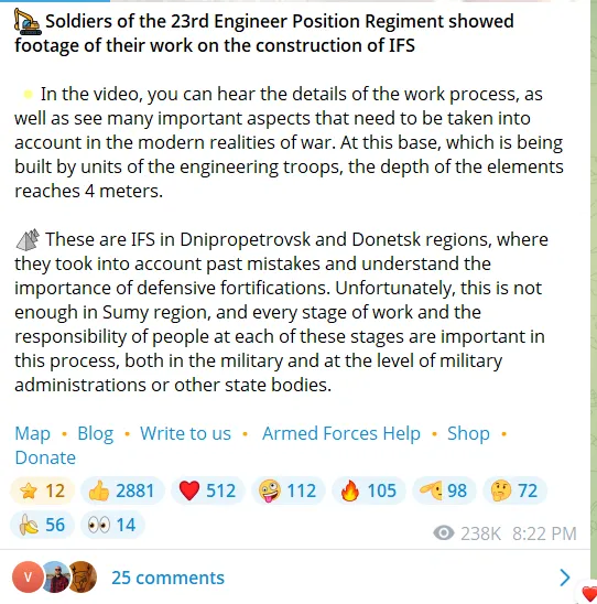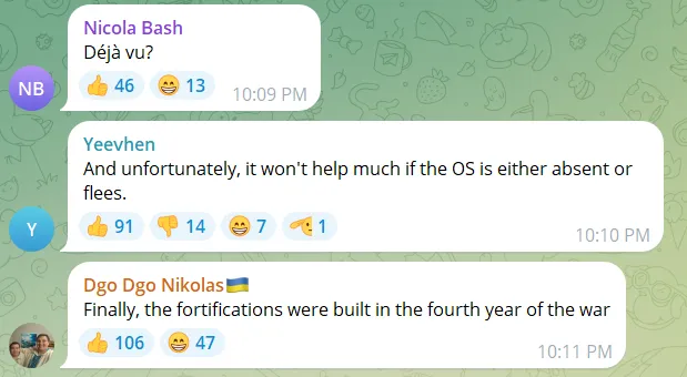 Megnéztem a hírhez fűzött kommenteket a DeepState telegramon. Ez Ukrajna legnagyobb katonai blogja, közel 800 000 feliratkozóval. A legnépszerűbb kommentelőket nem nyűgözte le a hír, rámutatva, hogy hasonló kijelentéseket már korábban is tettek, kevés eredménnyel, és hogy az erődítmények nem sokat jelentenek, ha nincs gyalogság (OS), amely megvédi őket.