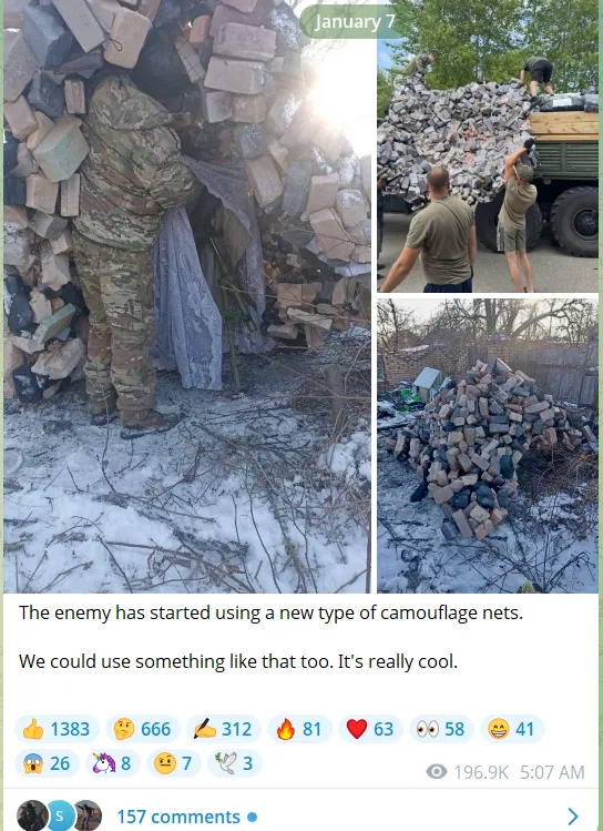 Oroszország, mint általában, messze megelőzi a védekező módszereket. Oroszország ezt először a „Szurovikin-vonal” hatékonyságával mutatta meg a 2023-as ukrán ellentámadás visszaverésében. Oroszország volt az első, amely drónellenes hálózatokat állított fel, kezdetben az ukránok gúnyolódására. Most az oroszok új, rendkívül valósághű álcázóhálókkal kísérleteznek, amelyeket a helyi terephez igazítanak. Ezt először Szergej Bezkresztnov drónelemző tette közzé , és azóta sokan mások, köztük Sztanyiszlav Bunyatov is irigységgel osztották meg újra.