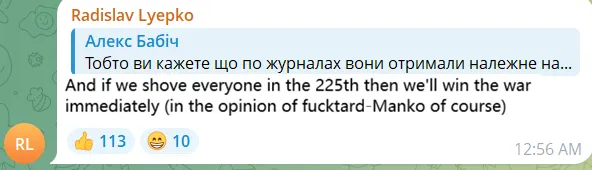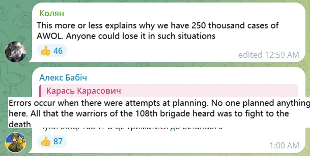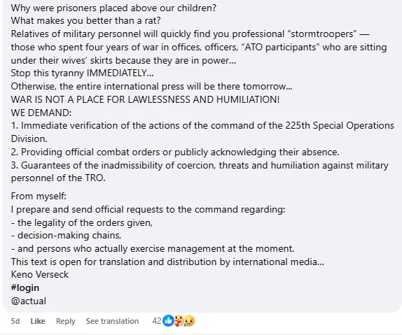 Egy január 7-i bejegyzéshez fűzött kommentben azzal vádolták a 108. ezred parancsnokát, hogy „húsként” adja el csapatait a 225. rohamegységnek: