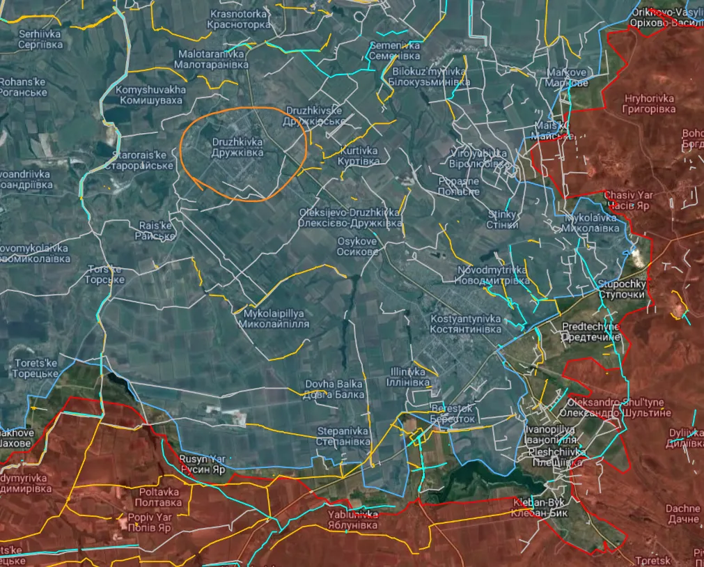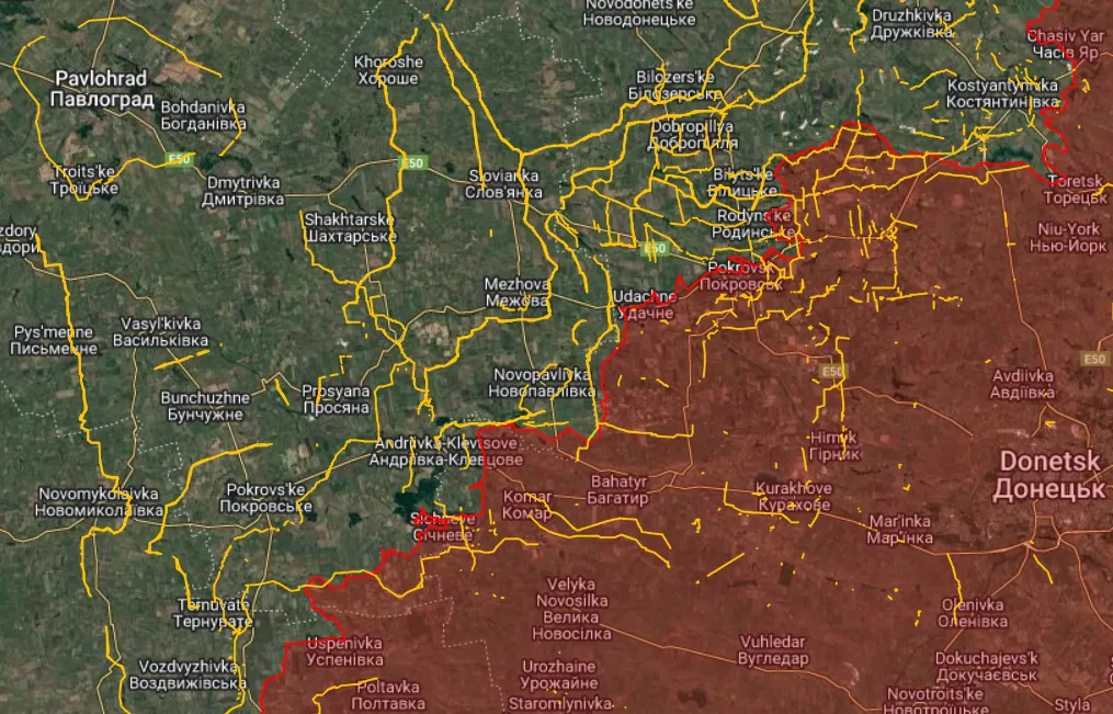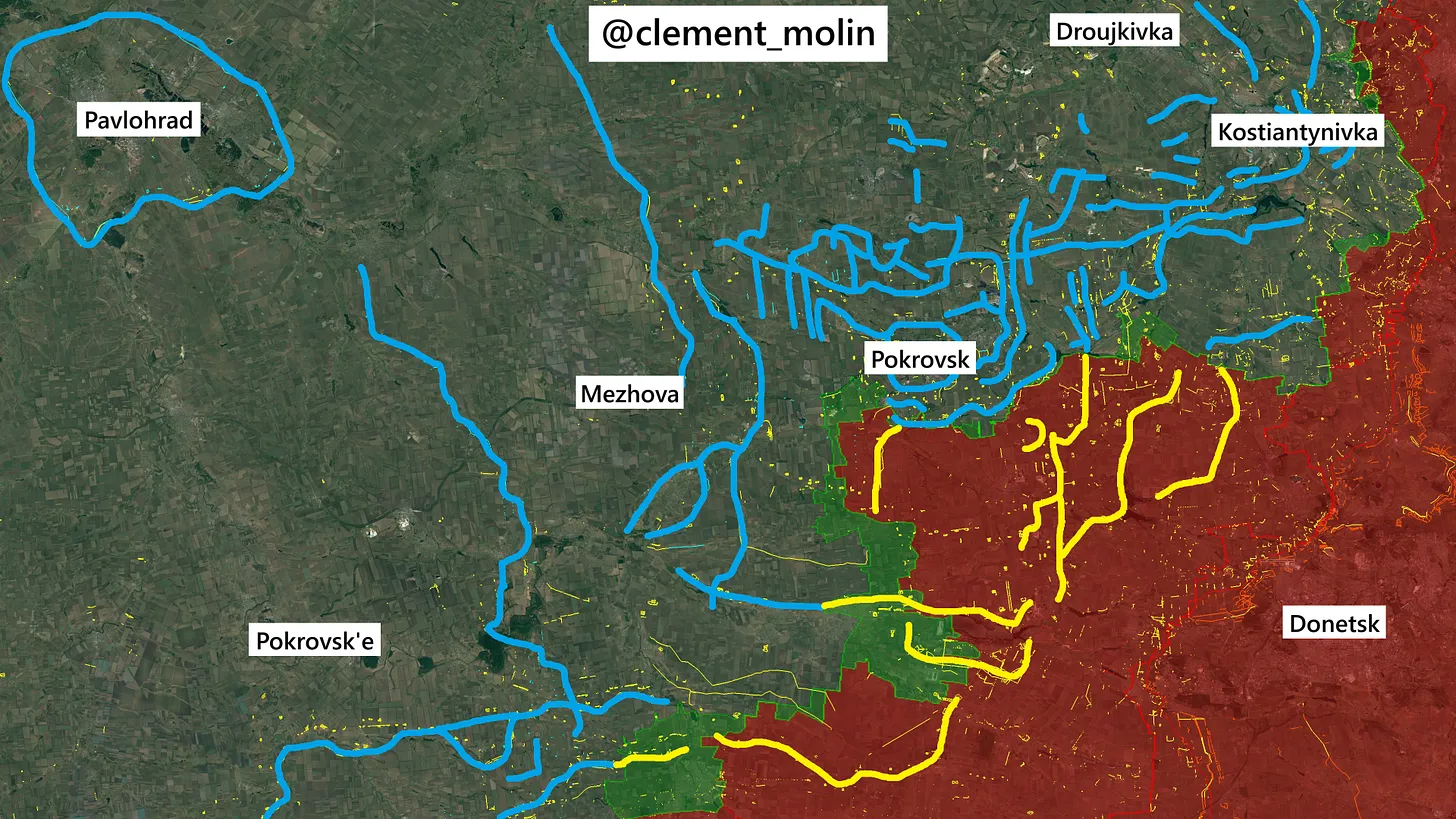 Jelentős orosz előrenyomulások figyelhetők meg 2025 folyamán a déli területen, Pokrovszke (nem Pokrovszk) és Mezhova felé. Molin térképe is kevesebb védelmi erődítményt mutatott ott.