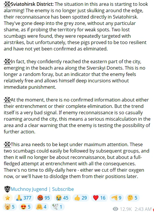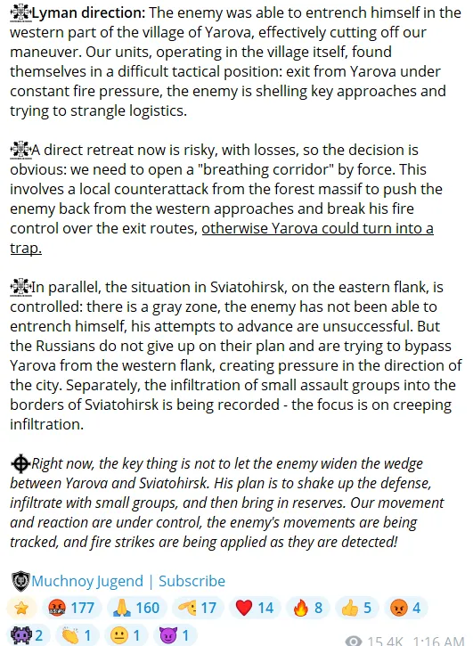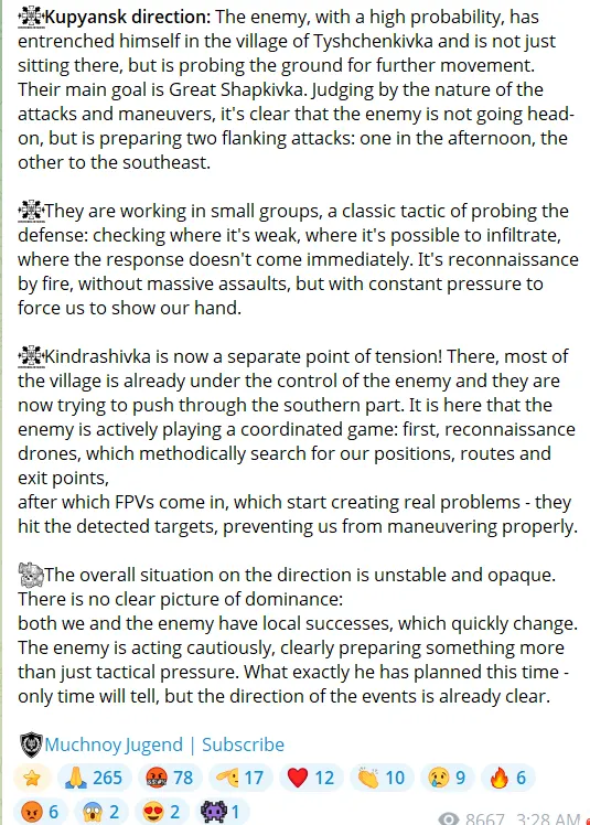 Általánosságban úgy tűnik, hogy az ellenség megpróbálja ránk erőltetni ezt a kezdeményezést: fokozatos előrenyomulás, pozíciók biztosítása, a védelem kiterjesztése és az utánpótlási útvonalak elleni csapások. A forgatókönyv nem gyors, de szisztematikus és veszélyes - a cél a tér kimerítése és ellenőrzése.