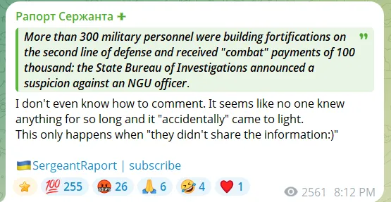Január 9-én az ukrán rendvédelmi szervek letartóztatták a nemzeti gárda egyik tisztjét, aki a Zaporizzsje régióban erődítményépítésekből hasznot húzott. Állítólag 72 millió hrivnya kárt okozott az államnak, katonáit a frontvonalon szolgálóknak minősítve (ezért sokkal magasabb fizetést kaptak), miközben valójában védelmi építményeket építettek. Az Állami Nyomozó Iroda közzétette a szóban forgó vonalakról készült fotókat (2024 januárja és májusa között épültek):