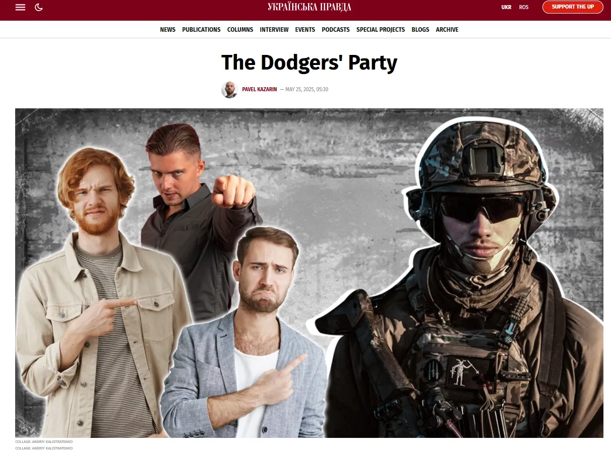 A militaristák politikai kockázatokat is látnak a dezertőrökben. 2025 májusában Ukrajna vezető „ sorosita ” liberális nacionalista lapja, az Ukrajinszka Pravda híres vezércikkében figyelmeztetett, hogy a behívóelkerülők milliói a jövőben a nacionalisták rivális politikai erejét képezhetik. Amint az alábbi képen is látható, az Ukrajinszka Pravda ( krónikus behívóelkerülői ) határozottan a furcsa fekete-fehér foltos bátor katona oldalán állnak, nem pedig a NATO-ért meghalni nem akaró aljas férfiak oldalán.