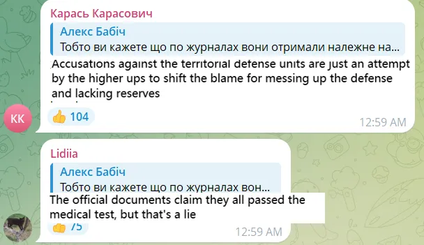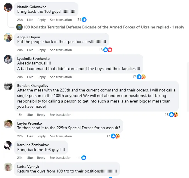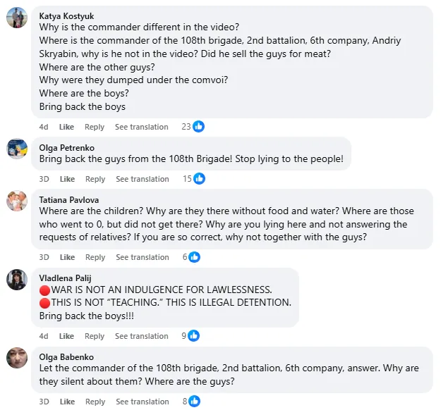 A 108. ezred katonáinak hozzátartozói minden bizonnyal meggyőződtek a „félrekommunikációról” és a „kiképzésekről” szóló hivatalos állításokról. Egészen más történetet mesélnek a 108. ezred Facebook-bejegyzéseihez fűzött hozzászólásaikban, amelyek január 5- én kezdtek megjelenni . Ez a hozzászólás egy január 6-i bejegyzésből származik , amelyben azt állítják, hogy a 108. ezred csapatainak kiképzése lendületesen halad. Megjegyzendő, hogy a területi védelmi egységek rövidítése „TRO”. Az „ATO” a donbasszi háború 2014-2017-es időszakára utal.