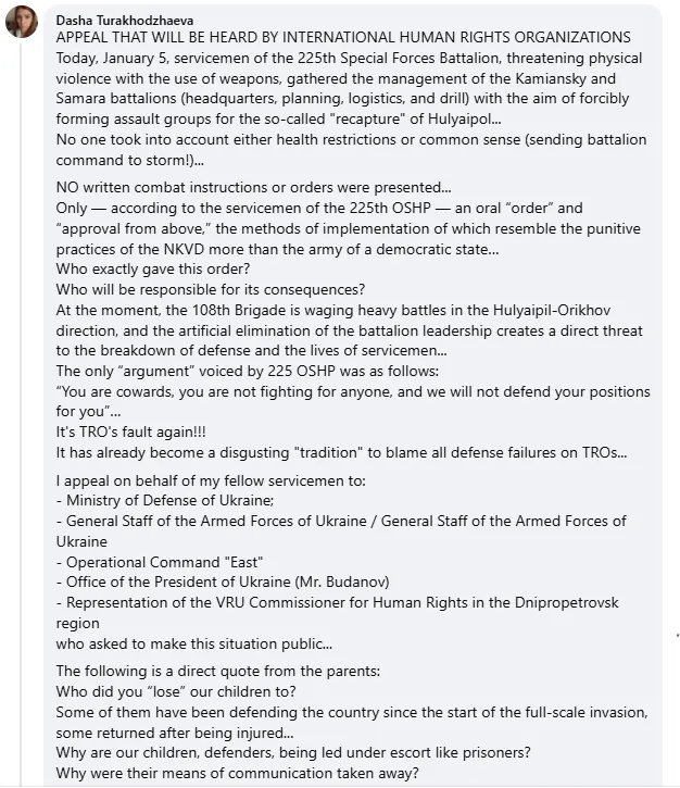 Januárban új jelentések láttak napvilágot arról, hogy a 225. rohamozdony hogyan bántalmazta a 108. területvédelmi dandár csapatait. A 108. ezred felelős a Zaporizzsje megyei Huliaipole városáért , amelyet az oroszok decemberben foglaltak el mindössze 4 hét harc után.
