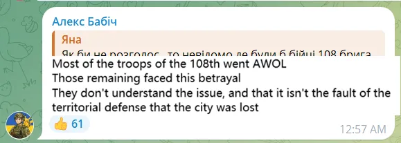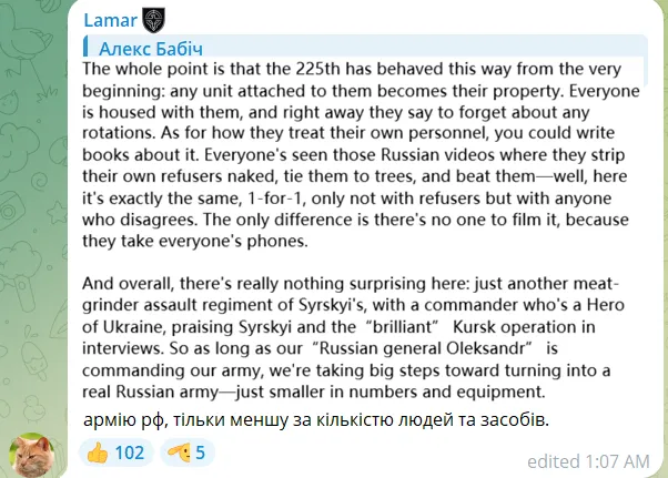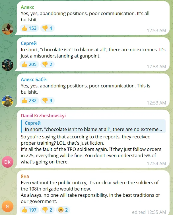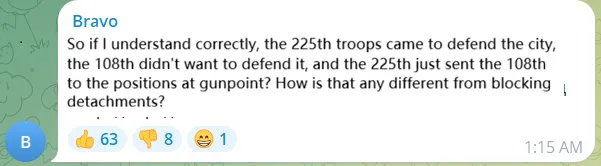 Hajlamos vagyok inkább a kommentelőknek hinni, mint a DeepState-nek és a nacionalista újságíróknak. Nem valószínű, hogy a 225. hadosztály elrabolta volna a 108. hadosztály katonáit és ellopta volna a telefonjaikat pusztán a kiképzésük céljából.