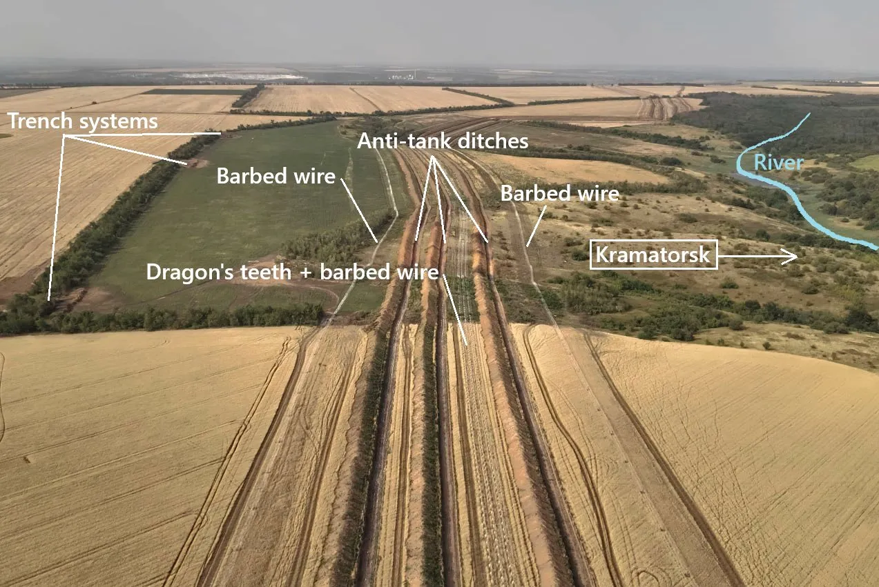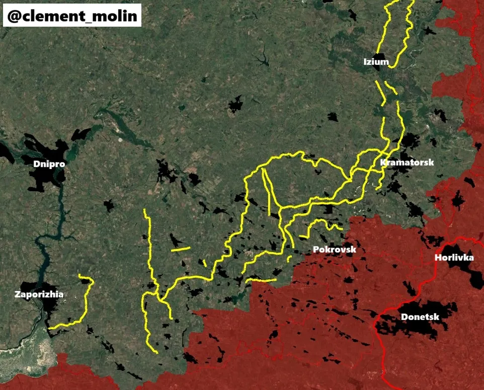 Molin térképe a Pokrovszk és Myrnograd környéki védelmi építmények nagy részét mutatja, ami nem meglepő, tekintve e városok viszonylag nagyobb méretét, stratégiai helyzetét és a médiafigyelmet, amit kaptak. Mindazonáltal az orosz hadsereg 2025 folyamán leküzdötte ezen védelmi építmények jelentős részét.