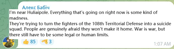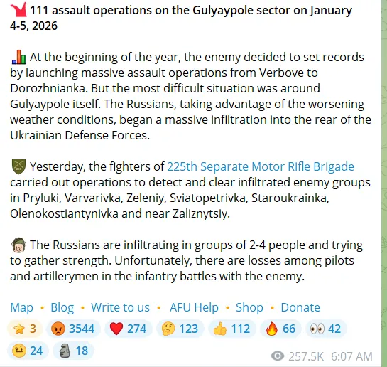 Korábban már írtam azokról a jelentésekről, miszerint ukrán rohamegységek lövöldöztek a Zaporizzsje megyei Huliaipole városát védő területvédelmi brigádok ellen. A területvédelmi egységek alulmotivált civil katonákkal és alulfizetett tisztekkel vannak tele. Decemberben arról számoltak be, hogy az egyik Huliaipole környéki területvédelmi egység még dezertálásra is buzdította csapatait. Ezzel szemben a rohamegységeket brutálisan fegyelmezi a parancsnokság, szigorú utasítások alapján, hogy mindenáron tartsák a területet.