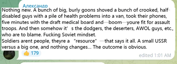 Mindenki látta már azokat az orosz videókat, ahol levetkőztetik a saját, harcot megtagadó tagjaikat, fákhoz kötözik és megverik őket – nos, itt pontosan ugyanaz a helyzet, 1 az 1-hez, csak nem azokkal, akik nem hajlandók harcolni, hanem bárkivel, aki nem ért egyet. Az egyetlen különbség az, hogy nincs, aki lefilmezze, mert mindenkinek elveszik a telefonját.