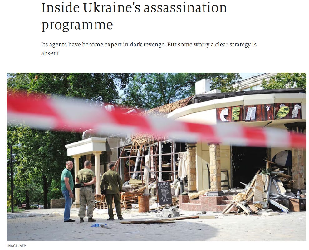 2023-ban az Economist cikket közölt Ukrajna merényletprogramjáról. A fotó Alekszandr Zaharcsenko 2018-as donyecki meggyilkolását ábrázolja, amelyet 2022-ig mindig belső orosz vitákkal okoltak. Hogyan változnak az idők?