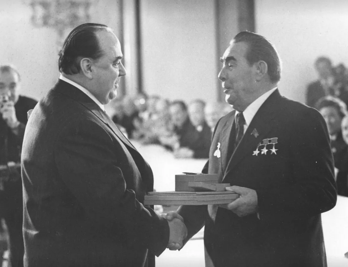 A KGB első helyettes vezetője (1967-82), Szemén Cvigun (balra) találkozik régi barátjával, Brezsnyevvel, 1970-es évek