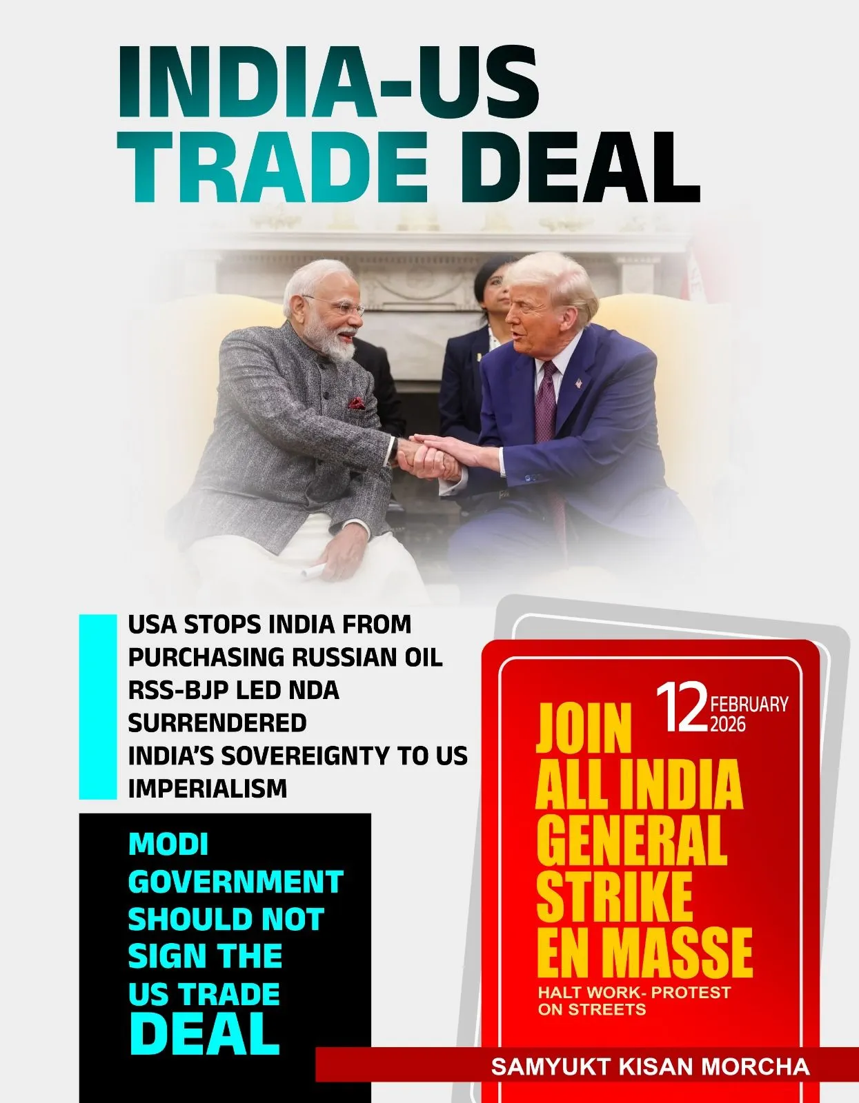 Az SKM egyik kulcsfontosságú szervezete, az Öszindia Kisan Sabha (AIKS) kijelentette, hogy az India és az Egyesült Államok között létrejött megállapodás az ország szuverenitásának teljes átadását jelenti Trumpnak. A megállapodás „áttöri India vidéki gazdaságának gerincét” – hangsúlyozta a múlt héten kiadott közleményében.