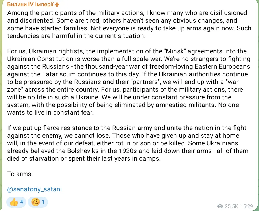 Vessünk például egy pillantást erre a 2022. február 20-i bejegyzésre , amelyet egy katonai veterán által vezetett ukrán nacionalista távirat, a „Tales of the IV Reich” tett közzé: