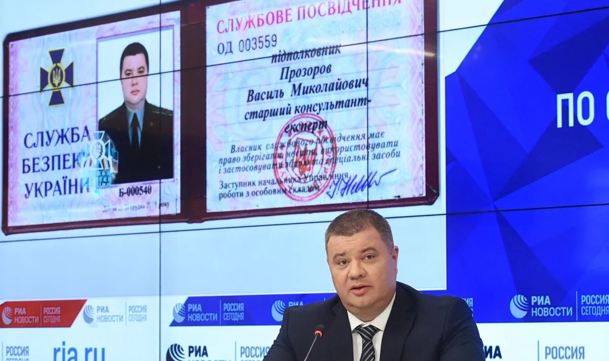 Prozorov sajtótájékoztatója, a háttérben az SBU tiszti igazolványával