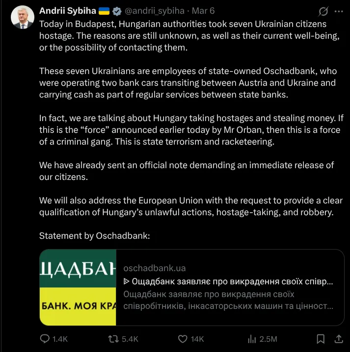 „Az Oschadbank két pénzszállító járművét, a behajtócsoport hét tagjának kíséretében, jogtalanul tartóztatták le Magyarországon egy Raiffeisen Bank Austria és az Oschadbank közötti rutinszerű deviza- és banki fémszállítás során. A GPS-adatok szerint az illegálisan letartóztatott Oschadbank járművek Budapest belvárosában, az egyik magyar bűnüldöző szerv közelében találhatók. A járművek hollétét Ukrajna Magyarországi Nagykövetségének és az Ukrán Külügyminisztérium képviselői megerősítették. Az Oschadbank alkalmazottainak holléte jelenleg ismeretlen.”