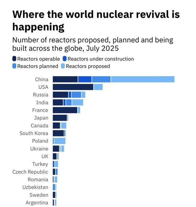 Továbbá a kínai elektromos hálózatot sokkal nagyobb arányban működtetik megújuló energiával, mint bárhol máshol. Kína több új napelemes kapacitást telepít, mint a világ többi része együttvéve, és ezzel csak tovább növeli vezető szerepét a napenergia-termelésben. A szélenergia terén is dominálnak. Jelenleg az Egyesült Államok vezet az online atomerőművek tekintetében, de Kínában több atomerőmű van építés alatt, mint a világ többi részén együttvéve: