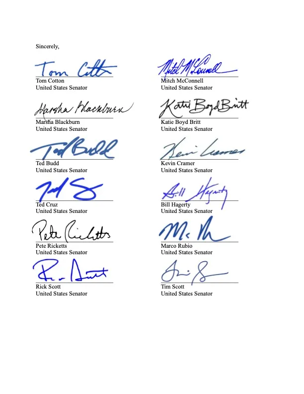 Katie Britt alabamai szenátor, a levél egyik republikánus aláírója a Zeteo-nak azt mondta, hogy ez "nem fenyegetés - ígéret". A levelet aláíró másik 11 republikánus szenátor a cikk megjelenéséig nem válaszolt a Zeteo megkeresésére."
