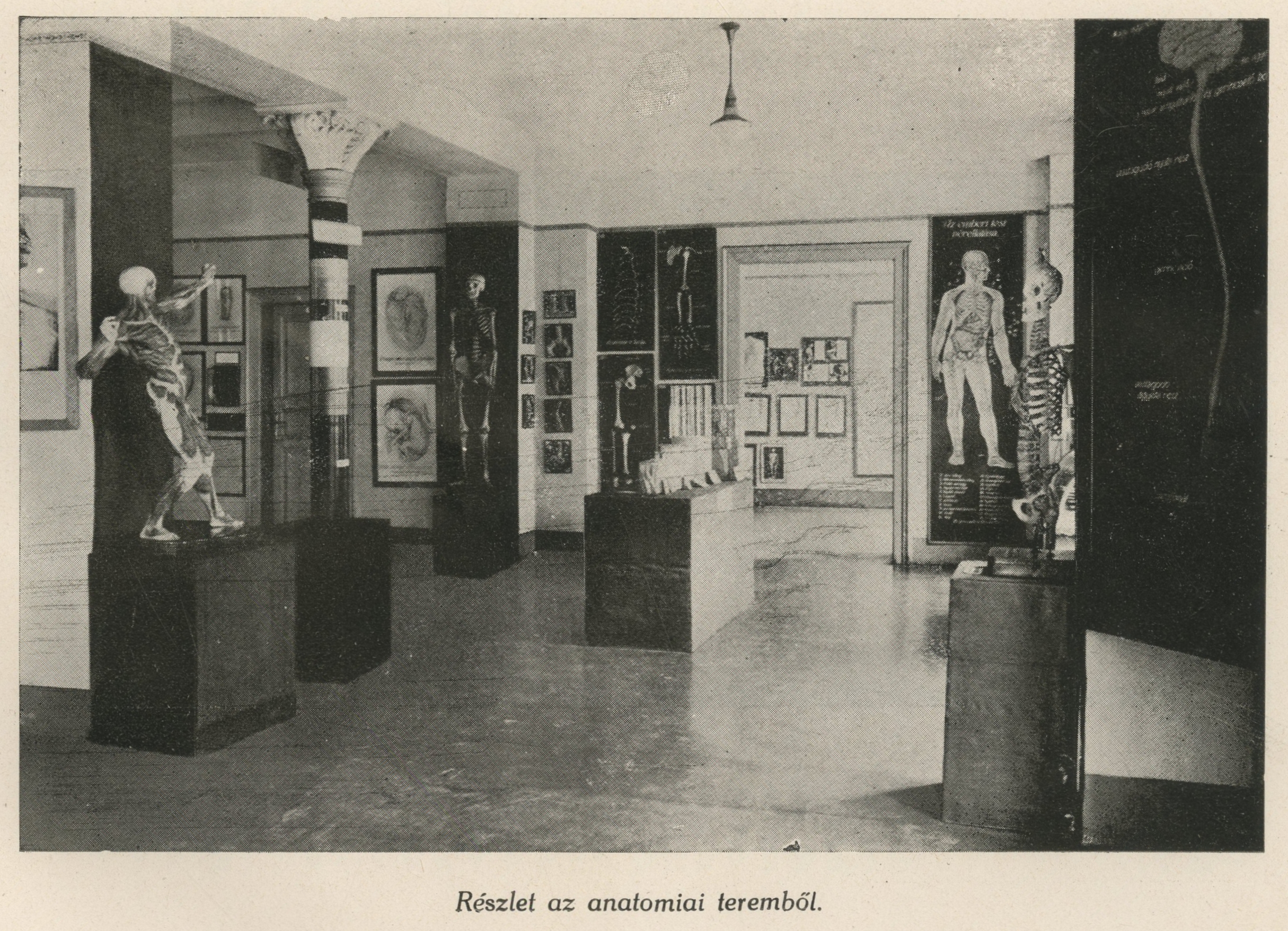 Részlet az 1928-ban újranyitott múzeum tereiből: Anatómiai gyűjtemény teremből. Gortvay György: A Népegészségügyi Múzeum munkája. 1935. Budapest: Egyesült Nyomda. 75. (Őze Eszter: A dolgozó testek múzeuma)