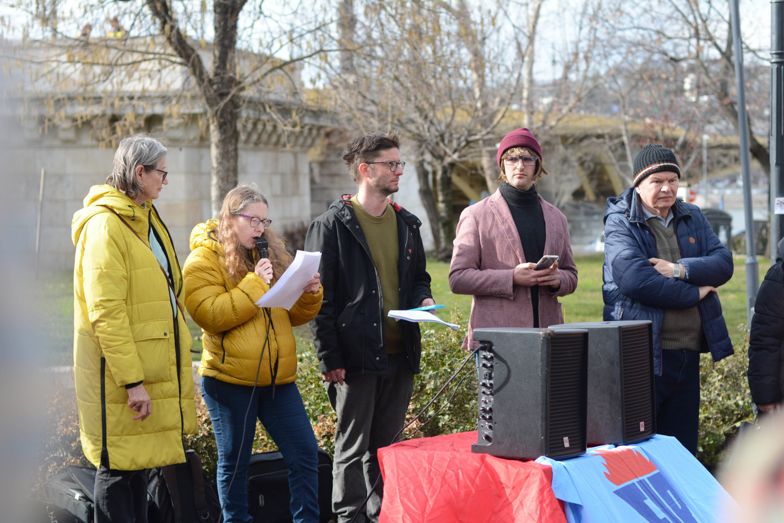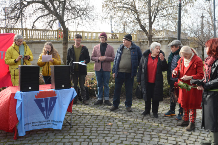 A Jászai Mari téren tartott sajtótájékoztatón az „antifa-perben” elítélt Maja T. rokonai és támogatói valamint más szervezetek, többek között a FIR – Federation Internationale des Resistants Association Antifasciste (Az ellenállók nemzetközi szövetsége – Antifasiszták szövetsége) képviselői is felszólaltak.