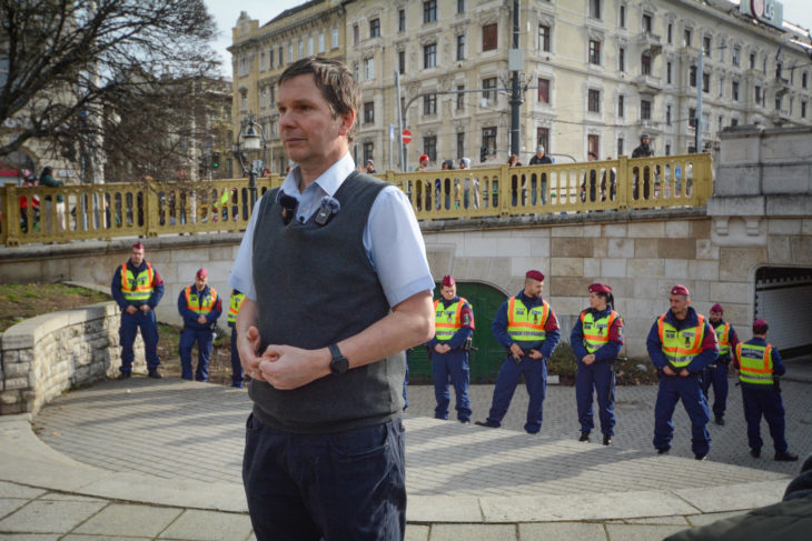 Rendőrök igazoltatnak a Magyar Ellenállók és Antifasiszták Szövetsége valamint az antifa-per érintettjeinek sajtótájékoztatóján 2026. február 14-én. Fotó: Bulecza Noémi / Mérce