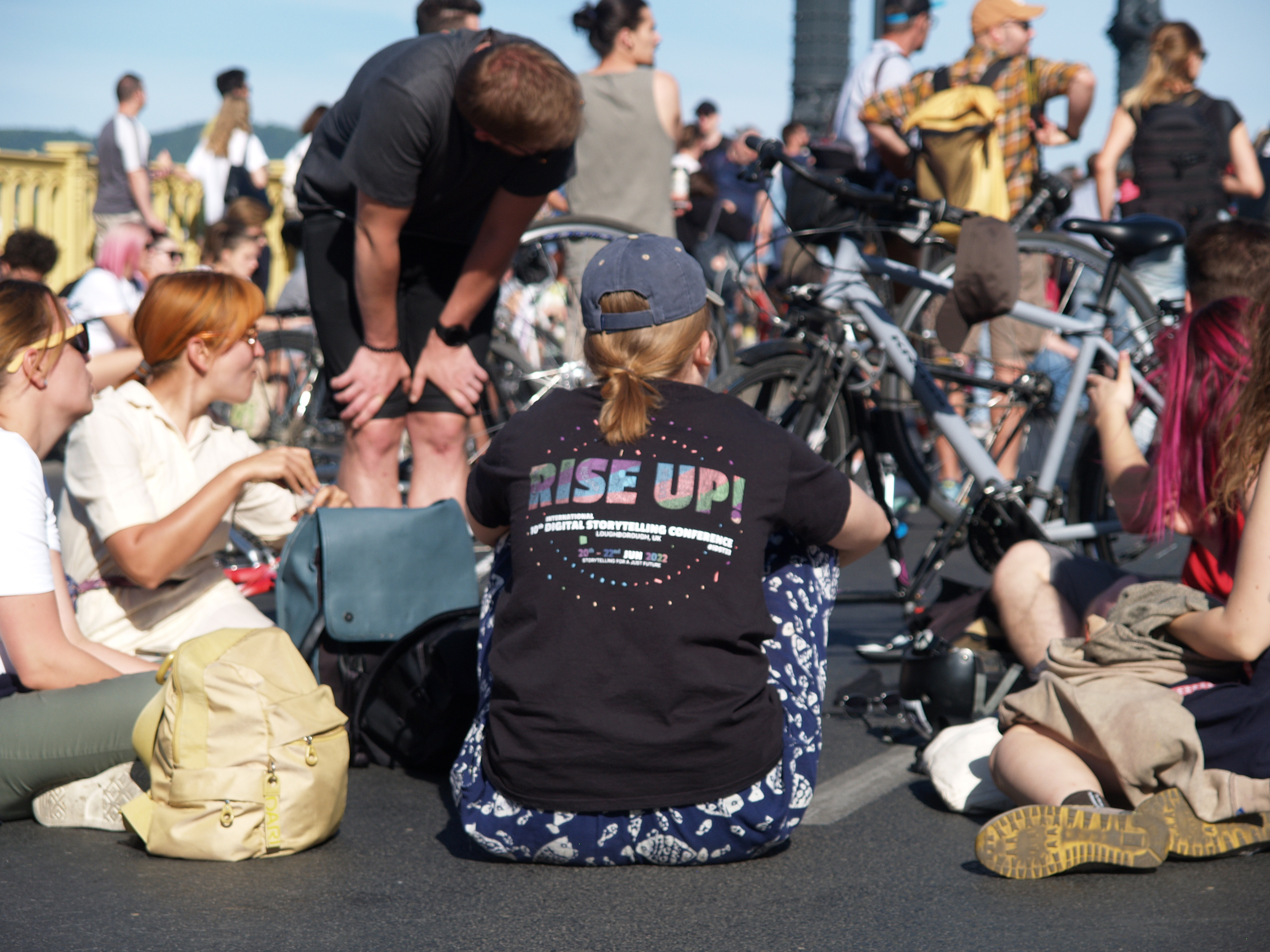 Résztvevők ülnek a futárok kata szigorítása és rezsinövelés elleni tüntetésén a Margit hídon 2022. VII. 18-án. Fotó: Kiss Soma Ábrahám / Mérce