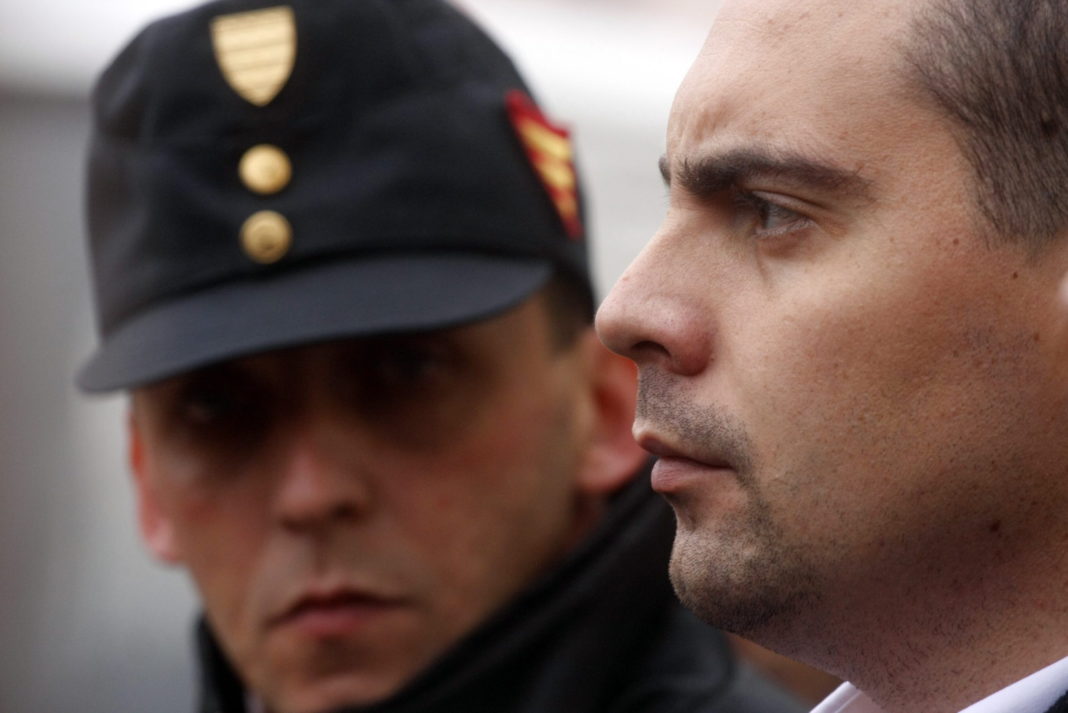 Sajóbábony, 2009. november 17.Vona Gábor, a Jobbik elnöke (j) és Kiss Róbert, az Új Magyar Gárda kapitánya sajtótájékoztatót tart Sajóbábonyban a városháza elõtt, mielõtt lakossági fórumot tartanának a helyi általános iskolában.MTI Fotó: Vajda János
