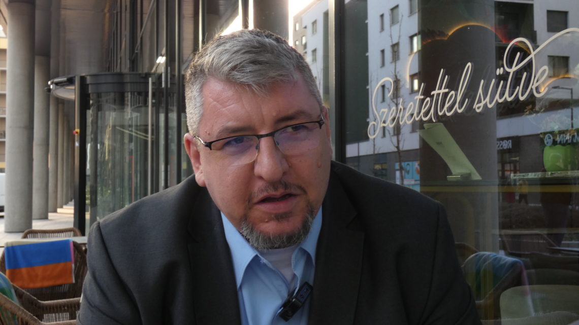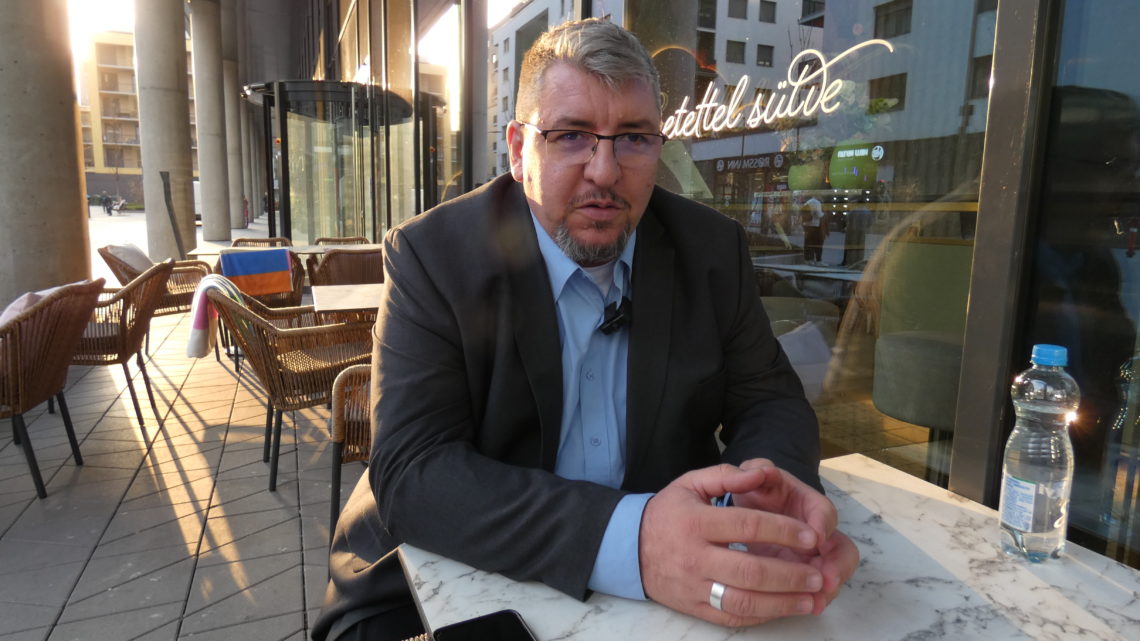 Sinka István, a Magyar Független Fuvarozók Egyesületének főtitkára interjút ad a Mércének. Fotó: Bogatin Bence/Mérce