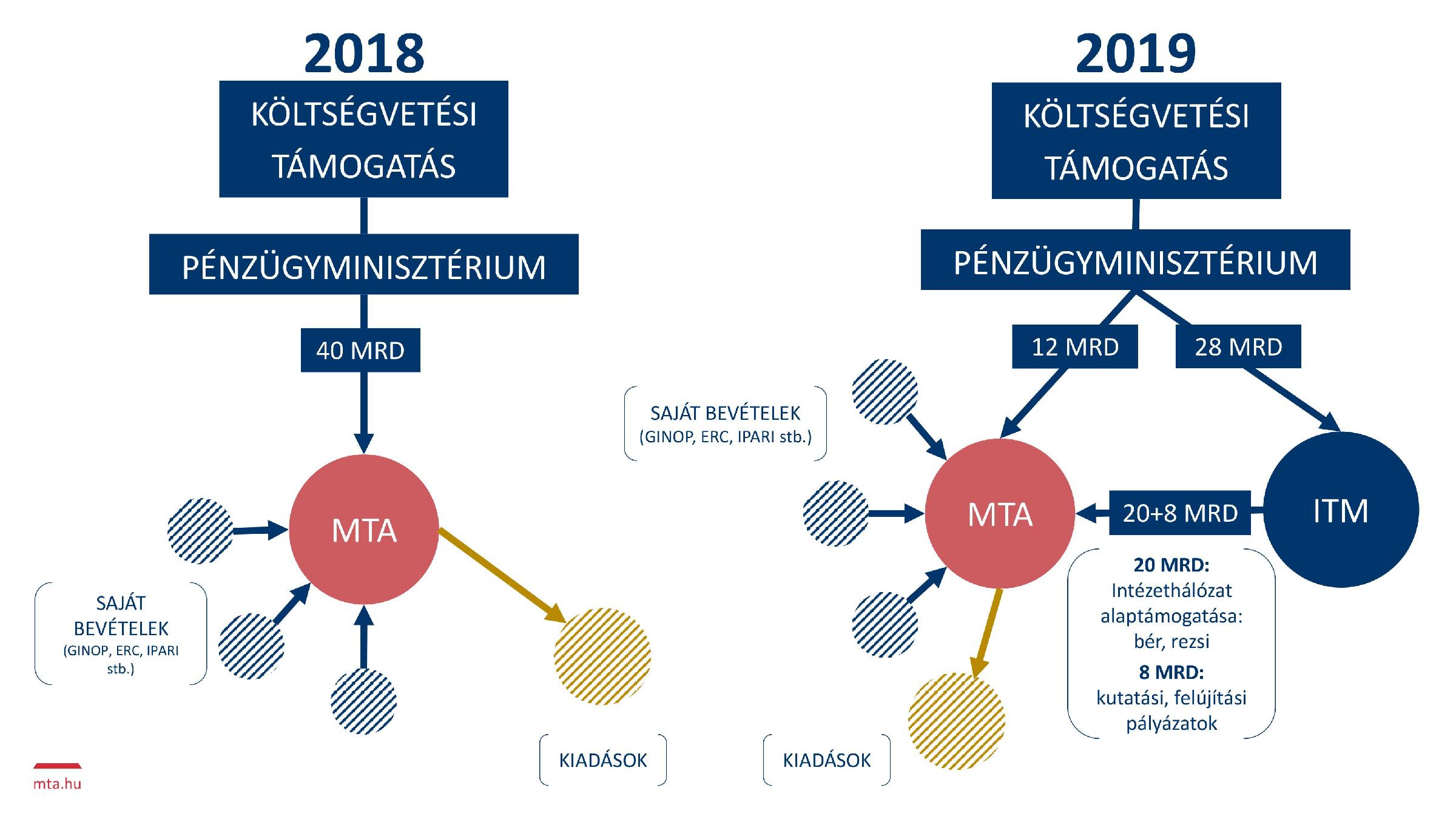 A kapott javaslat olyan kormányzati kezdeményezést készít elő, amely az MTA kutatóhálózatának működését érintően a kutatás-fejlesztési forrásokat az Innovációs és Technológiai Minisztérium költségvetési fejezetébe utalja. A Pénzügyminisztériumból június 13-án megküldött új költségvetési keretszám szerint 2019-ben az összesen kb. 40 milliárd forintos MTA költségvetési alap-előirányzatból 28 milliárd forint kerülne át az ITM-hez (lásd az alábbi ábrán). A 28 milliárdból kb. 20 milliárd forint a kutatások témájától független (alapfeladatokkal kapcsolatos) bér- és működési költségeket tartalmaz.