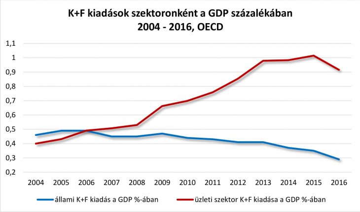 A hazai K+F kiadások finanszírozásában az állam szerepe (részvétele) 2006 óta – egy rövid stagnálás után – folyamatosan csökkent és csökken ma is. A 2016-os 1,206 %-os GDP-arányos K+F költés túlnyomó részét (0,916 %) finanszírozta az üzleti szektor és az összes költés csupán negyedét a magyar állam (0,29 %).